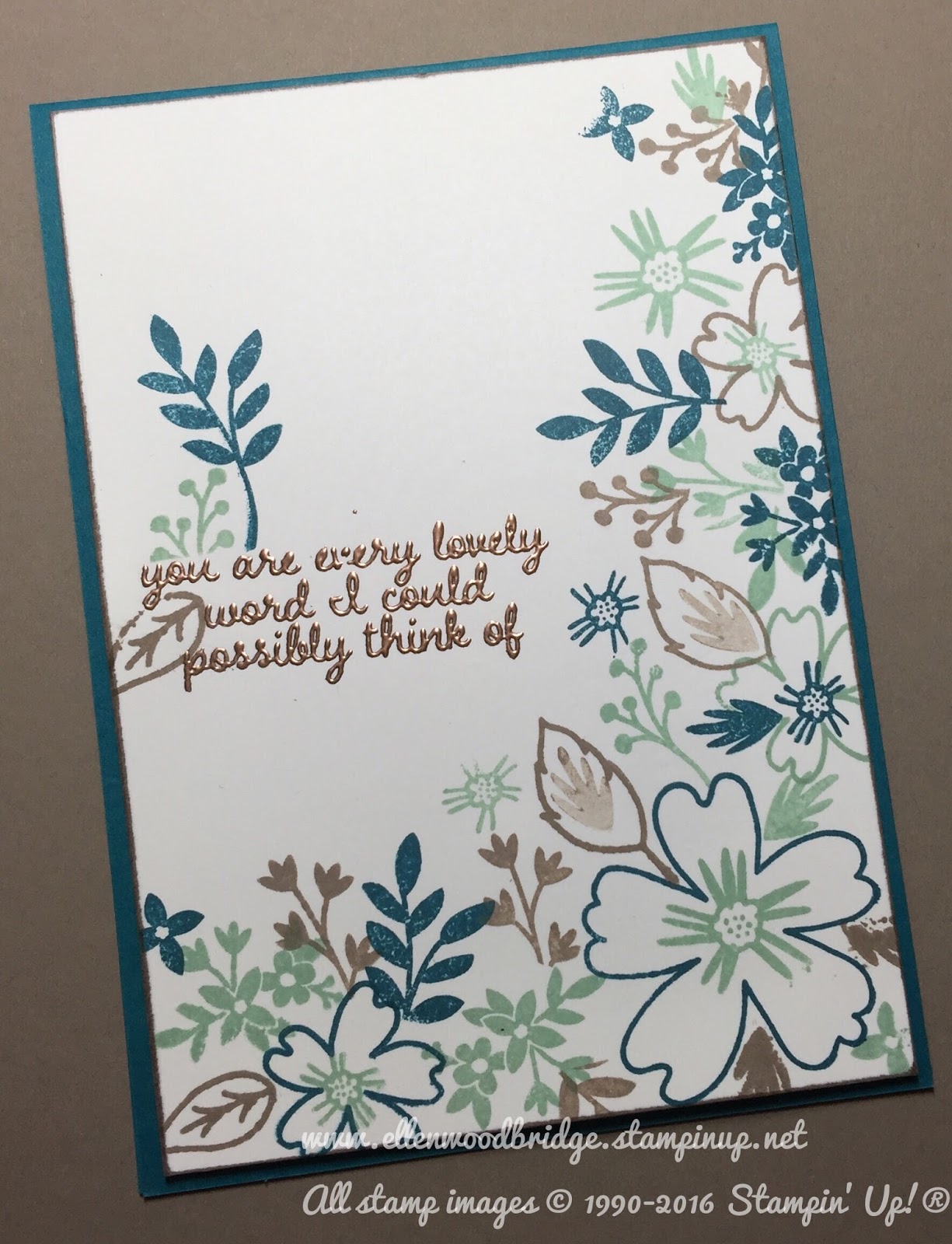 I started the card with a Whisper White card stock piece slightly smaller than a standard card. I mounted majority of the image stamps from the Love & Affection set onto our Clear Blocks and grabbed the 3 ink colour Tip Top Taupe, Mint Macron and Island Indigo. I stamped the flowers in the corner first and extended and filled in with the other stamps from there. I cleaned each stamp after using it so it was ready for the next colour. Once I was happy with the composition I took the sentiment to make sure it fitted and I didn't need any extra stamping. To ready the area for embossing I ran the Embossing Buddy over the card from to ensure no stray pieces of powder where I don't want them, I stamped the sentiment also from the Love & Affection set in Versamark ink and covered the image in Copper Embossing powder and used our Heat Tool to melt the powder. I added a few more imaged around the sentiment to finish off the card from and mounted it with Stampin' Dimensionals to a Island Indigo Card Base.
